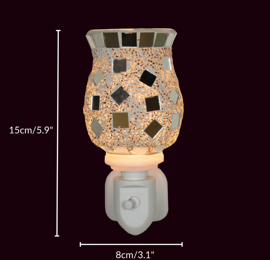 Experience elevated home fragrance with the Mosaic Plug In Electric Warmer in silver. Efficient heat distribution safely melts scented wax, providing consistent, long-lasting aroma without open flames. Its sleek design adds a modern touch to any room while effortlessly enhancing ambiance. Enjoy your favorite scents with ease.